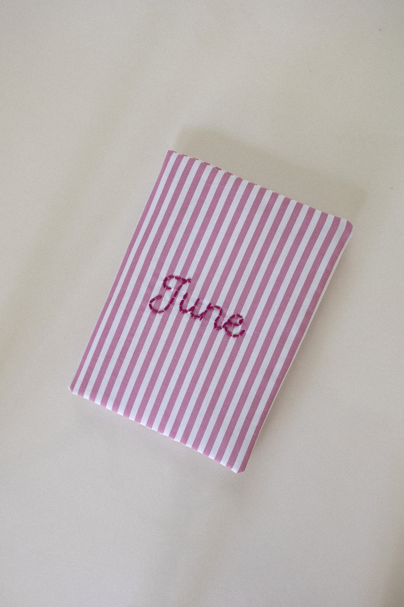 Our notebook or agenda cover fits all standard A5 notebooks and planners. Each piece is hand-embroidered and handcrafted in our own atelier using organic, Oeko-Tex certified cotton. The design features pink stripes. You can personalise your cover with a name, word, or initials in your favourite colour!